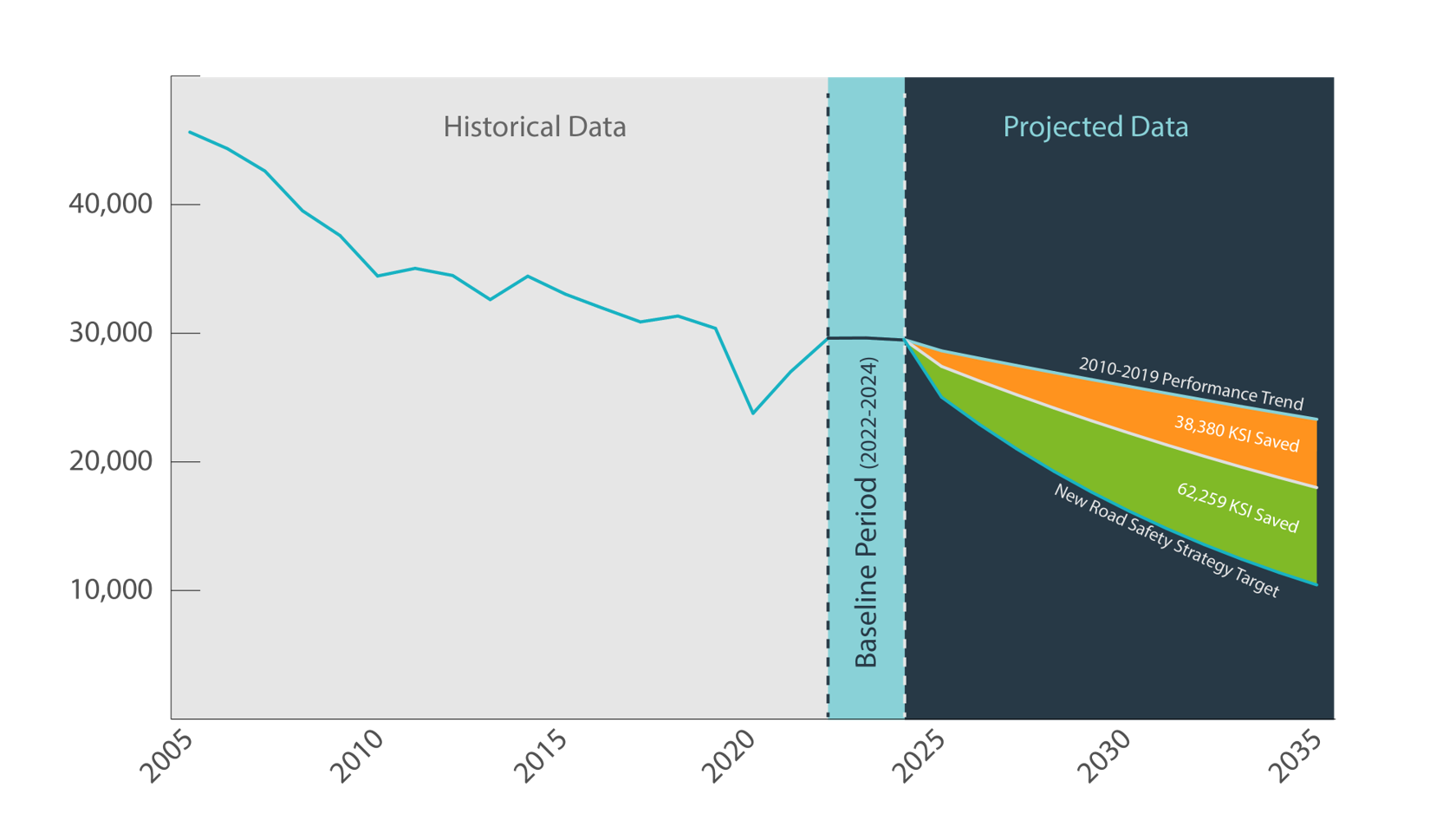 - The KSI trends from 2005-09 (following the last government strategy with targets and more meaningful progress) are repeated from 2026 to 2035